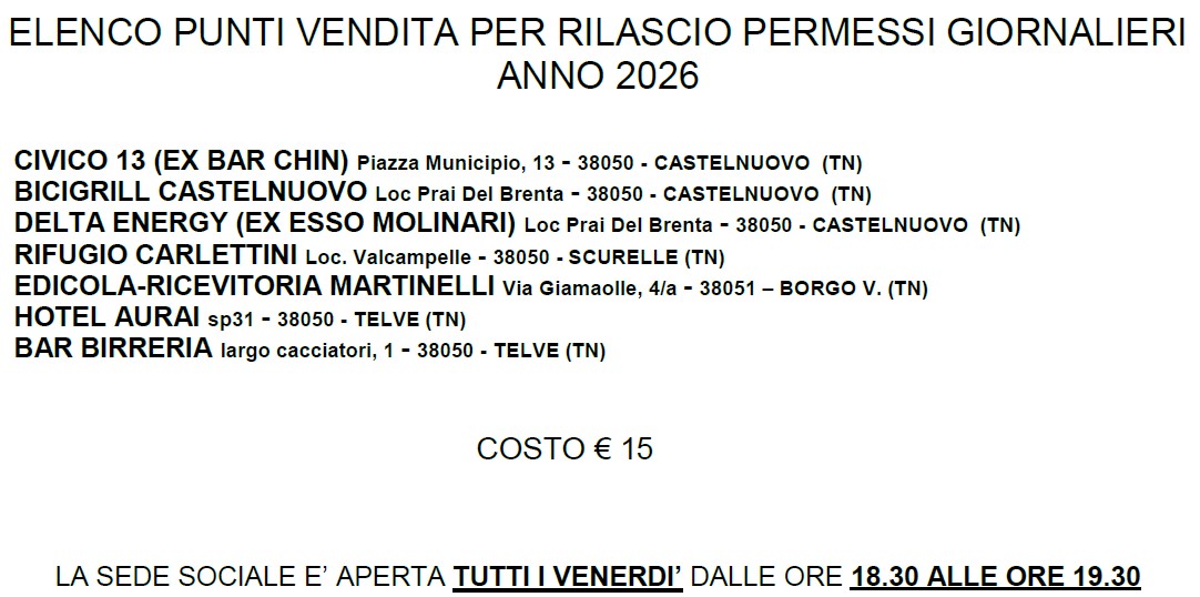 PER IL RINNOVO O RILASCIO DEI PERMESSI E’ POSSIBILE RIVOLGERSI AI RAPPRESENTANTI COMUNALI COMPONENTI DEL CONSIGLIO DIRETTIVO OPPURE RECARSI PRESSO LA SEDE SOCIALE, MUNITI DI COPIA DEL VERSAMENTO O ASSEGNO, APERTA TUTTI I VENERDI’ DALLE ORE 18.30 ALLE ORE 19.30